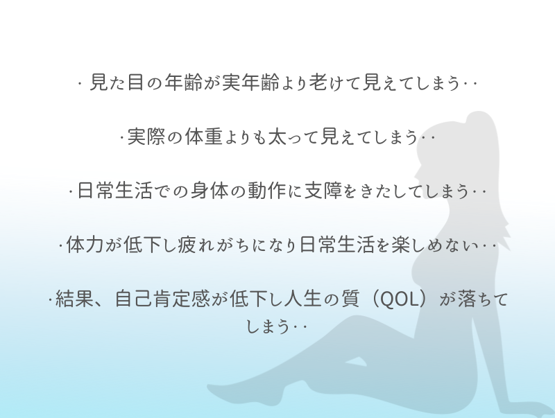 ・下腹ポッコリ、腰まわりの浮き輪肉、背中のはみ肉など身体のたるみが気になる・・